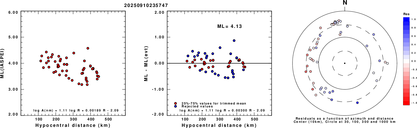Left: ML computed using the IASPEI formula for Vertical components (research). Center: ML residuals computed using a modified IASPEI formula that accounts for path specific attenuation; the values used for the trimmed mean are indicated. The ML relation used for each figure is given at the bottom of each plot.