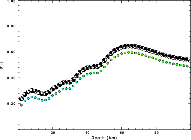 The program wvfgrd96 was used with good traces observed at short distance to determine the focal mechanism, depth and seismic moment. This technique requires a high quality signal and well determined velocity model for the Green's functions. To the extent that these are the quality data, this type of mechanism should be preferred over the radiation pattern technique which requires the separate step of defining the pressure and tension quadrants and the correct strike.