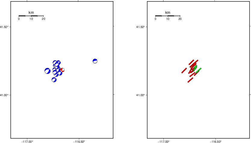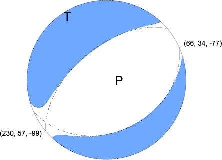 Moment Tensor Moment 1.777e+14 N-m Magnitude 3.43 Depth 8.9 km Percent DC 90% Half Duration - Catalog NN Data Source NN Contributor NN Nodal Planes Plane Strike Dip Rake NP1 230 57 -99 NP2 66 34 -77 Principal Axes Axis Value Plunge Azimuth T 1.820e+14 12 326 N -0.089e+14 8 235 P -1.731e+14 76 113 |