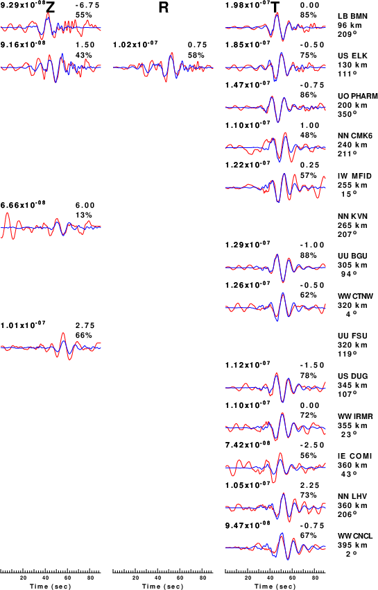 The comparison of the observed and predicted waveforms is given in the next figure. The red traces are the observed and the blue are the predicted. Each observed-predicted component is plotted to the same scale and peak amplitudes are indicated by the numbers to the left of each trace. A pair of numbers is given in black at the right of each predicted traces. The upper number it the time shift required for maximum correlation between the observed and predicted traces. This time shift is required because the synthetics are not computed at exactly the same distance as the observed, the velocity model used in the predictions may not be perfect and the epicentral parameters may be be off. A positive time shift indicates that the prediction is too fast and should be delayed to match the observed trace (shift to the right in this figure). A negative value indicates that the prediction is too slow. The lower number gives the percentage of variance reduction to characterize the individual goodness of fit (100% indicates a perfect fit).