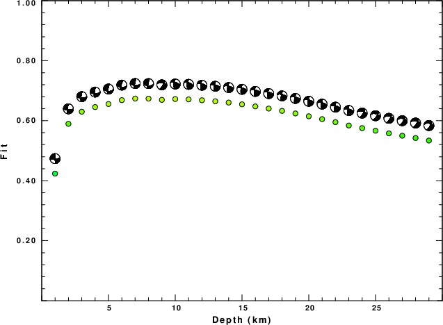 The program wvfgrd96 was used with good traces observed at short distance to determine the focal mechanism, depth and seismic moment. This technique requires a high quality signal and well determined velocity model for the Green's functions. To the extent that these are the quality data, this type of mechanism should be preferred over the radiation pattern technique which requires the separate step of defining the pressure and tension quadrants and the correct strike.