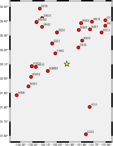 The focal mechanism was determined using broadband seismic waveforms. The location of the event (star) and the stations used for (red) the waveform inversion are shown in the next figure.