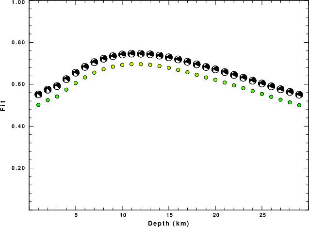 The program wvfgrd96 was used with good traces observed at short distance to determine the focal mechanism, depth and seismic moment. This technique requires a high quality signal and well determined velocity model for the Green's functions. To the extent that these are the quality data, this type of mechanism should be preferred over the radiation pattern technique which requires the separate step of defining the pressure and tension quadrants and the correct strike.