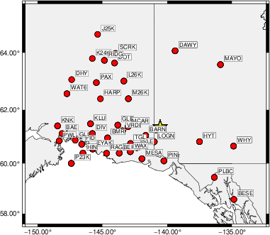 The focal mechanism was determined using broadband seismic waveforms. The location of the event (star) and the stations used for (red) the waveform inversion are shown in the next figure.