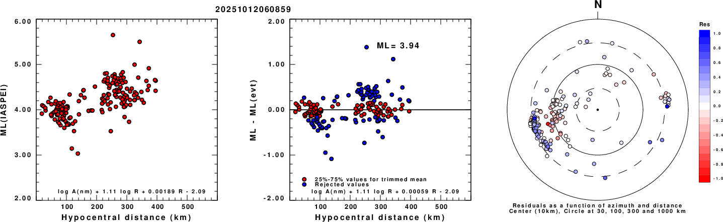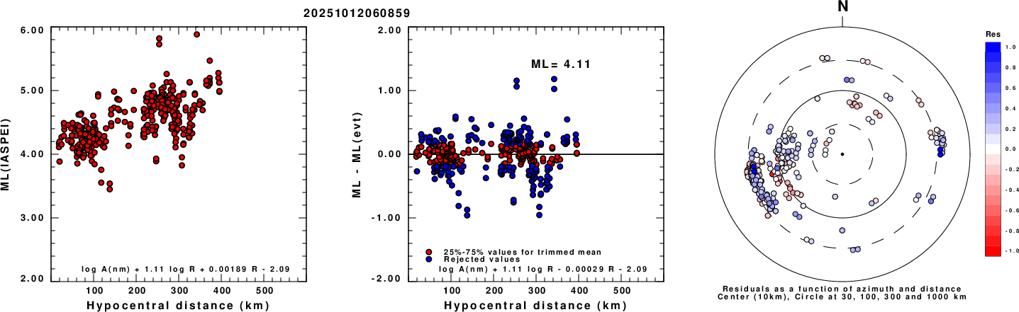 Left: ML computed using the IASPEI formula for Vertical components (research). Center: ML residuals computed using a modified IASPEI formula that accounts for path specific attenuation; the values used for the trimmed mean are indicated. The ML relation used for each figure is given at the bottom of each plot.