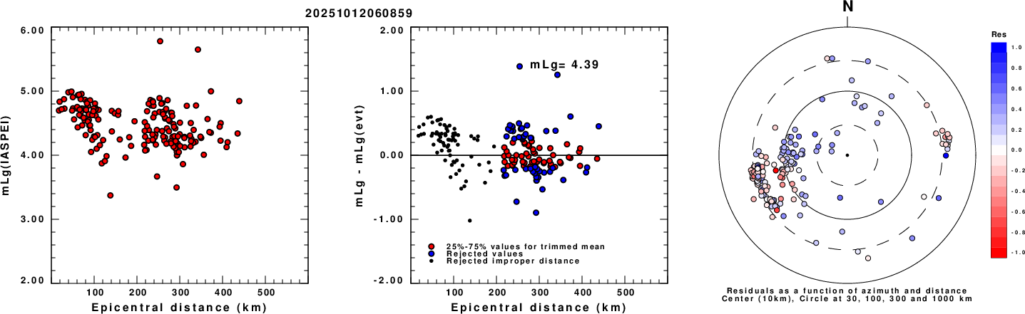 Left: mLg computed using the IASPEI formula. Center: mLg residuals versus epicentral distance ; the values used for the trimmed mean magnitude estimate are indicated.