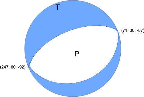 egional Moment Tensor (Mwr) Moment 1.643e+15 N-m Magnitude 4.08 Mwr Depth 4.0 km Percent DC 99% Half Duration - Catalog US Data Source US Contributor US Nodal Planes Plane Strike Dip Rake NP1 247 60 -92 NP2 71 30 -87 Principal Axes Axis Value Plunge Azimuth T 1.640e+15 15 339 N 0.006e+15 2 248 P -1.646e+15 75 153 |