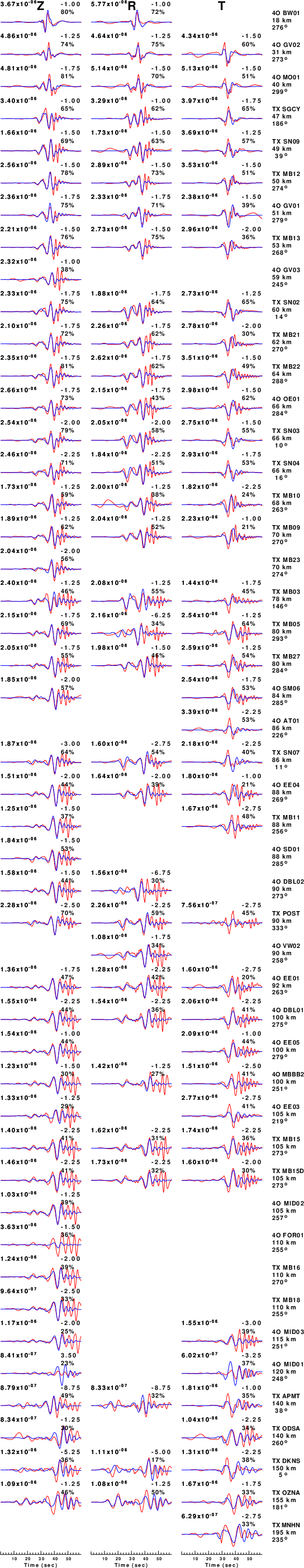 The comparison of the observed and predicted waveforms is given in the next figure. The red traces are the observed and the blue are the predicted. Each observed-predicted component is plotted to the same scale and peak amplitudes are indicated by the numbers to the left of each trace. A pair of numbers is given in black at the right of each predicted traces. The upper number it the time shift required for maximum correlation between the observed and predicted traces. This time shift is required because the synthetics are not computed at exactly the same distance as the observed, the velocity model used in the predictions may not be perfect and the epicentral parameters may be be off. A positive time shift indicates that the prediction is too fast and should be delayed to match the observed trace (shift to the right in this figure). A negative value indicates that the prediction is too slow. The lower number gives the percentage of variance reduction to characterize the individual goodness of fit (100% indicates a perfect fit).