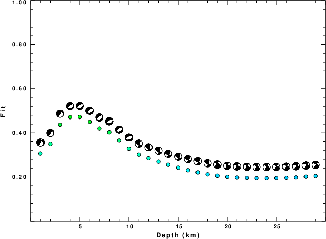 The program wvfgrd96 was used with good traces observed at short distance to determine the focal mechanism, depth and seismic moment. This technique requires a high quality signal and well determined velocity model for the Green's functions. To the extent that these are the quality data, this type of mechanism should be preferred over the radiation pattern technique which requires the separate step of defining the pressure and tension quadrants and the correct strike.