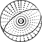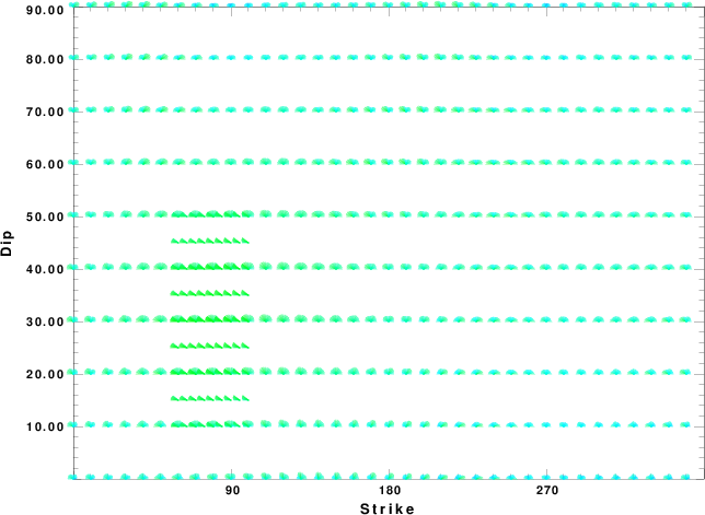 | Focal mechanism sensitivity at the preferred depth. The red color indicates a very good fit to the waveforms. Each solution is plotted as a vector at a given value of strike and dip with the angle of the vector representing the rake angle, measured, with respect to the upward vertical (N) in the figure. |