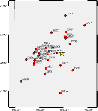 The focal mechanism was determined using broadband seismic waveforms. The location of the event (star) and the stations used for (red) the waveform inversion are shown in the next figure.