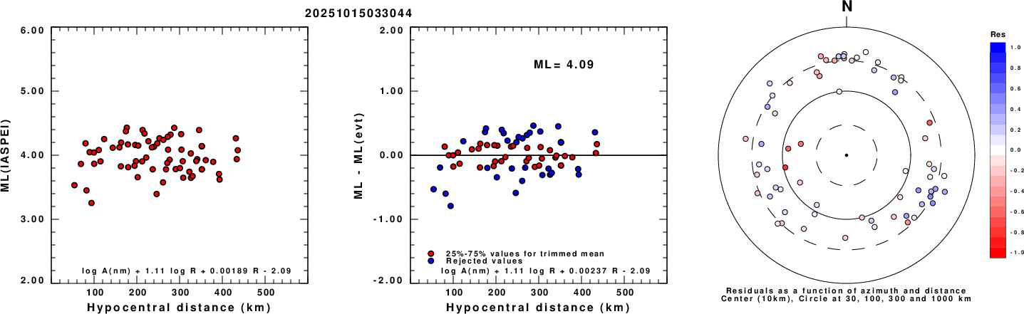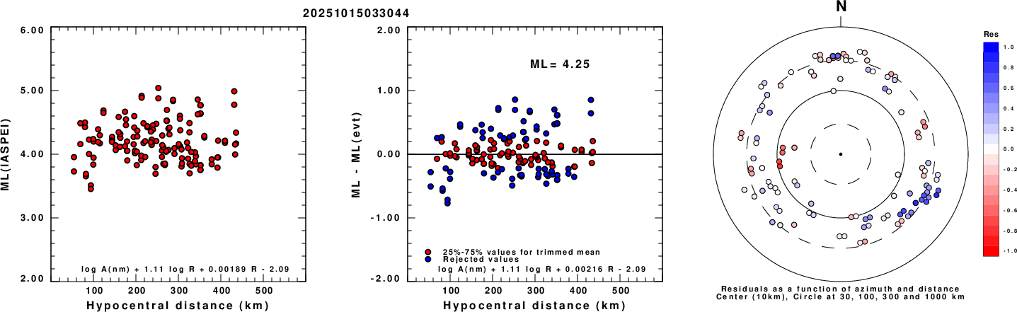 Left: ML computed using the IASPEI formula for Vertical components (research). Center: ML residuals computed using a modified IASPEI formula that accounts for path specific attenuation; the values used for the trimmed mean are indicated. The ML relation used for each figure is given at the bottom of each plot.