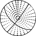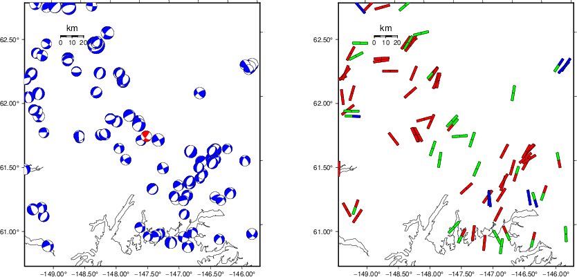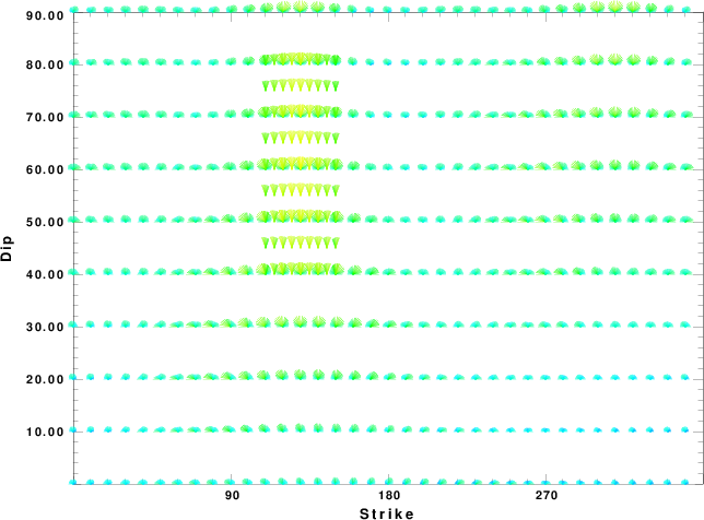 | Focal mechanism sensitivity at the preferred depth. The red color indicates a very good fit to the waveforms. Each solution is plotted as a vector at a given value of strike and dip with the angle of the vector representing the rake angle, measured, with respect to the upward vertical (N) in the figure. |