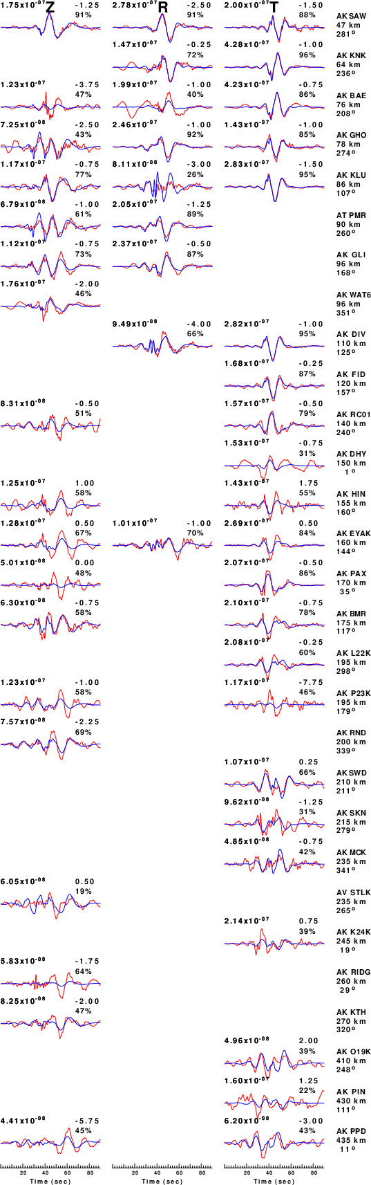 The comparison of the observed and predicted waveforms is given in the next figure. The red traces are the observed and the blue are the predicted. Each observed-predicted component is plotted to the same scale and peak amplitudes are indicated by the numbers to the left of each trace. A pair of numbers is given in black at the right of each predicted traces. The upper number it the time shift required for maximum correlation between the observed and predicted traces. This time shift is required because the synthetics are not computed at exactly the same distance as the observed, the velocity model used in the predictions may not be perfect and the epicentral parameters may be be off. A positive time shift indicates that the prediction is too fast and should be delayed to match the observed trace (shift to the right in this figure). A negative value indicates that the prediction is too slow. The lower number gives the percentage of variance reduction to characterize the individual goodness of fit (100% indicates a perfect fit).