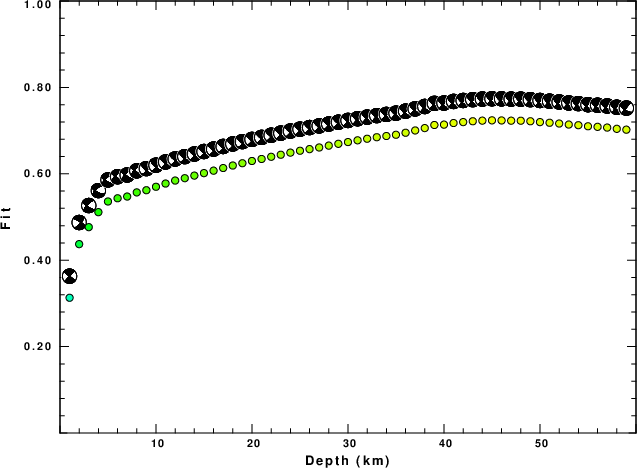 The program wvfgrd96 was used with good traces observed at short distance to determine the focal mechanism, depth and seismic moment. This technique requires a high quality signal and well determined velocity model for the Green's functions. To the extent that these are the quality data, this type of mechanism should be preferred over the radiation pattern technique which requires the separate step of defining the pressure and tension quadrants and the correct strike.