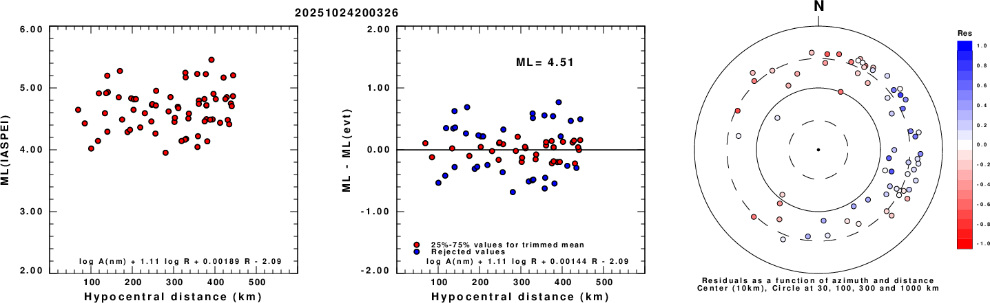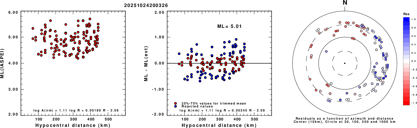 Left: ML computed using the IASPEI formula for Vertical components (research). Center: ML residuals computed using a modified IASPEI formula that accounts for path specific attenuation; the values used for the trimmed mean are indicated. The ML relation used for each figure is given at the bottom of each plot.