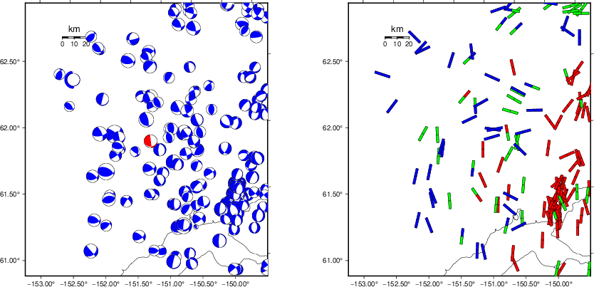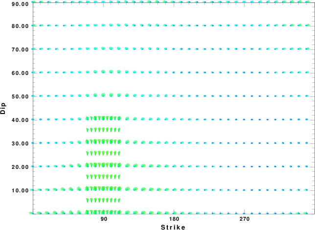 | Focal mechanism sensitivity at the preferred depth. The red color indicates a very good fit to the waveforms. Each solution is plotted as a vector at a given value of strike and dip with the angle of the vector representing the rake angle, measured, with respect to the upward vertical (N) in the figure. |
