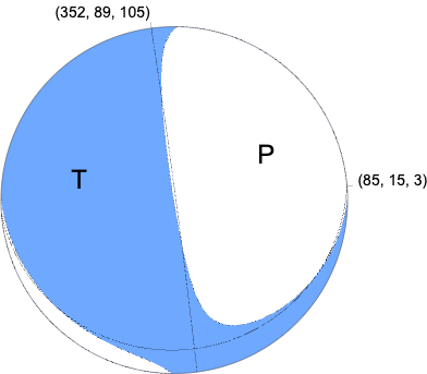 Regional Moment Tensor (Mwr) Moment 9.865e+15 N-m Magnitude 4.60 Mwr Depth 76.0 km Percent DC 84% Half Duration - Catalog US Data Source US Contributor US Nodal Planes Plane Strike Dip Rake NP1 352 89 105 NP2 85 15 3 Principal Axes Axis Value Plunge Azimuth T 9.419e+15 44 277 N 0.838e+15 15 172 P -10.257e+15 42 68 |