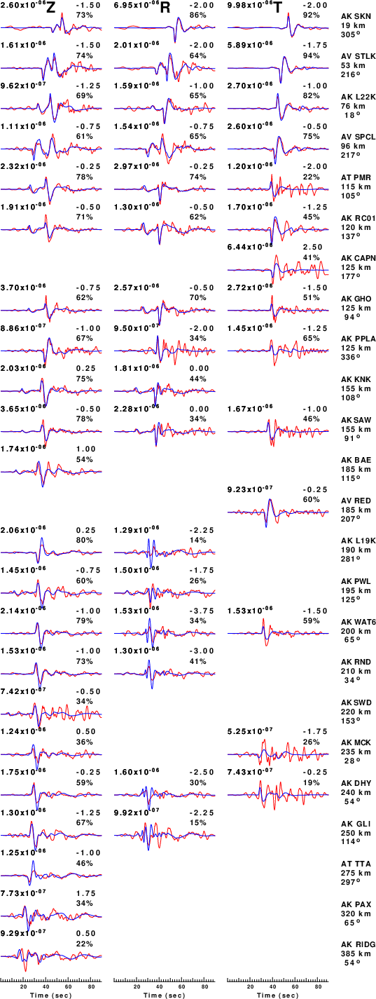 The comparison of the observed and predicted waveforms is given in the next figure. The red traces are the observed and the blue are the predicted. Each observed-predicted component is plotted to the same scale and peak amplitudes are indicated by the numbers to the left of each trace. A pair of numbers is given in black at the right of each predicted traces. The upper number it the time shift required for maximum correlation between the observed and predicted traces. This time shift is required because the synthetics are not computed at exactly the same distance as the observed, the velocity model used in the predictions may not be perfect and the epicentral parameters may be be off. A positive time shift indicates that the prediction is too fast and should be delayed to match the observed trace (shift to the right in this figure). A negative value indicates that the prediction is too slow. The lower number gives the percentage of variance reduction to characterize the individual goodness of fit (100% indicates a perfect fit).