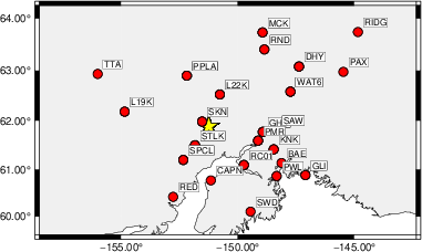The focal mechanism was determined using broadband seismic waveforms. The location of the event (star) and the stations used for (red) the waveform inversion are shown in the next figure.