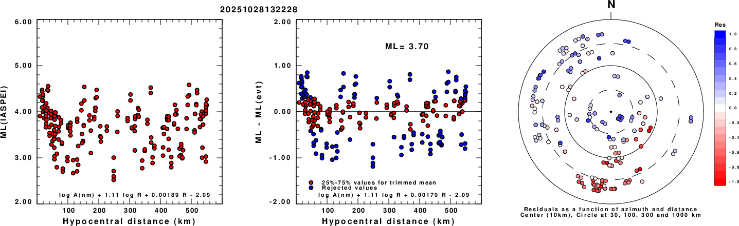 Given the availability of digital waveforms for determination of the moment tensor, this section documents the added processing leading to mLg, if appropriate to the region, and ML by application of the respective IASPEI formulae. As a research study, the linear distance term of the IASPEI formula for ML is adjusted to remove a linear distance trend in residuals to give a regionally defined ML. The defined ML uses horizontal component recordings, but the same procedure is applied to the vertical components since there may be some interest in vertical component ground motions. Residual plots versus distance may indicate interesting features of ground motion scaling in some distance ranges. A residual plot of the regionalized magnitude is given as a function of distance and azimuth, since data sets may transcend different wave propagation provinces.