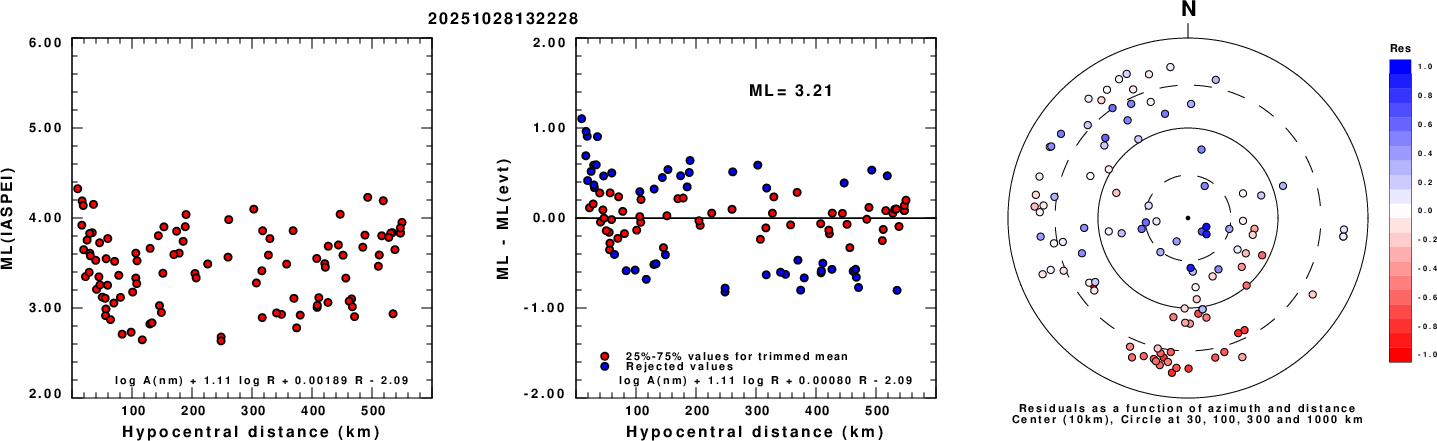 Left: ML computed using the IASPEI formula for Vertical components (research). Center: ML residuals computed using a modified IASPEI formula that accounts for path specific attenuation; the values used for the trimmed mean are indicated. The ML relation used for each figure is given at the bottom of each plot.