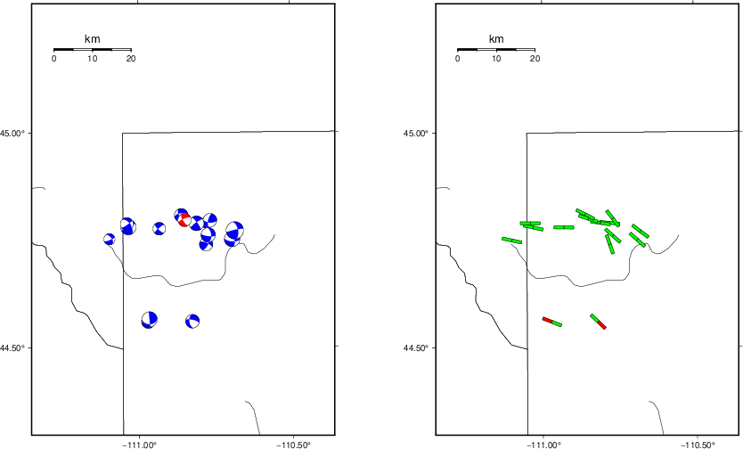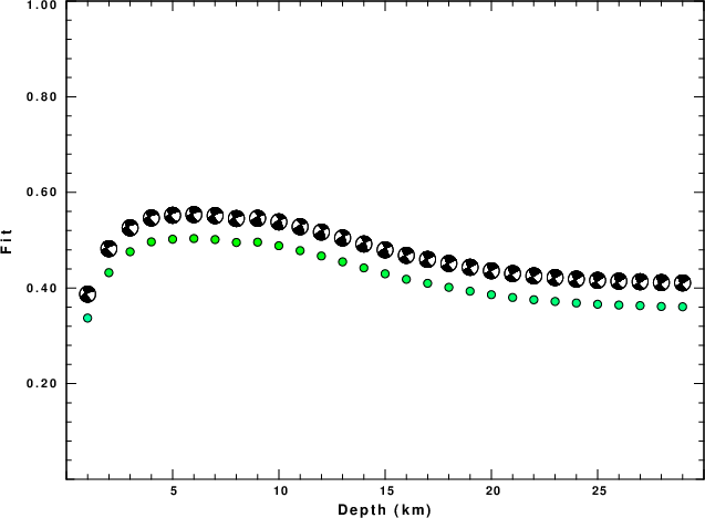 The program wvfgrd96 was used with good traces observed at short distance to determine the focal mechanism, depth and seismic moment. This technique requires a high quality signal and well determined velocity model for the Green's functions. To the extent that these are the quality data, this type of mechanism should be preferred over the radiation pattern technique which requires the separate step of defining the pressure and tension quadrants and the correct strike.