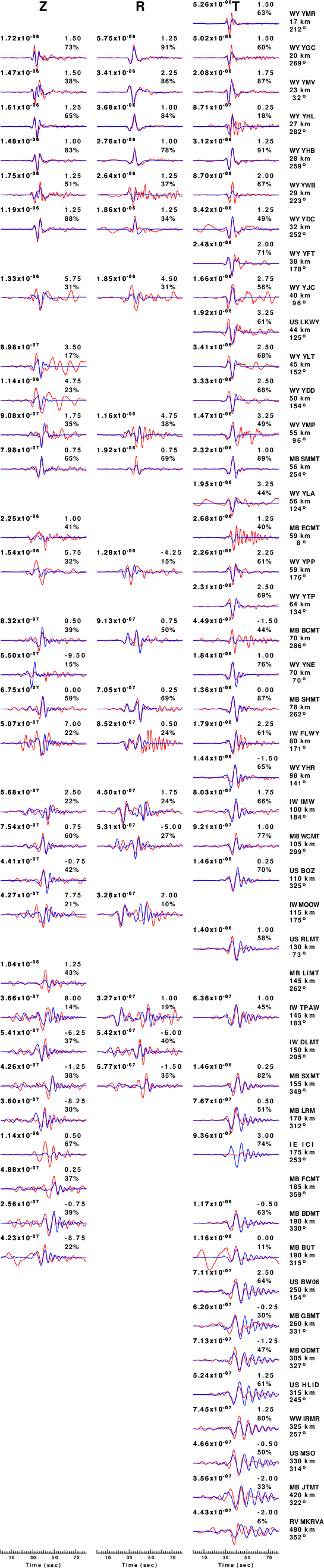 The comparison of the observed and predicted waveforms is given in the next figure. The red traces are the observed and the blue are the predicted. Each observed-predicted component is plotted to the same scale and peak amplitudes are indicated by the numbers to the left of each trace. A pair of numbers is given in black at the right of each predicted traces. The upper number it the time shift required for maximum correlation between the observed and predicted traces. This time shift is required because the synthetics are not computed at exactly the same distance as the observed, the velocity model used in the predictions may not be perfect and the epicentral parameters may be be off. A positive time shift indicates that the prediction is too fast and should be delayed to match the observed trace (shift to the right in this figure). A negative value indicates that the prediction is too slow. The lower number gives the percentage of variance reduction to characterize the individual goodness of fit (100% indicates a perfect fit).