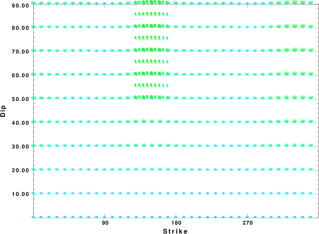 | Focal mechanism sensitivity at the preferred depth. The red color indicates a very good fit to the waveforms. Each solution is plotted as a vector at a given value of strike and dip with the angle of the vector representing the rake angle, measured, with respect to the upward vertical (N) in the figure. |
