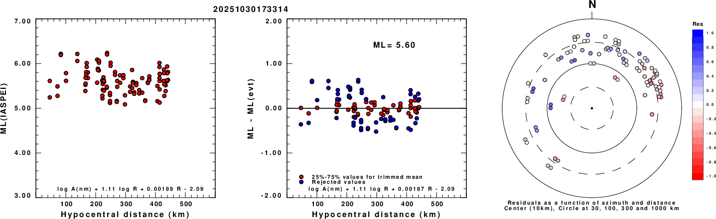Left: ML computed using the IASPEI formula for Vertical components (research). Center: ML residuals computed using a modified IASPEI formula that accounts for path specific attenuation; the values used for the trimmed mean are indicated. The ML relation used for each figure is given at the bottom of each plot.