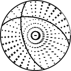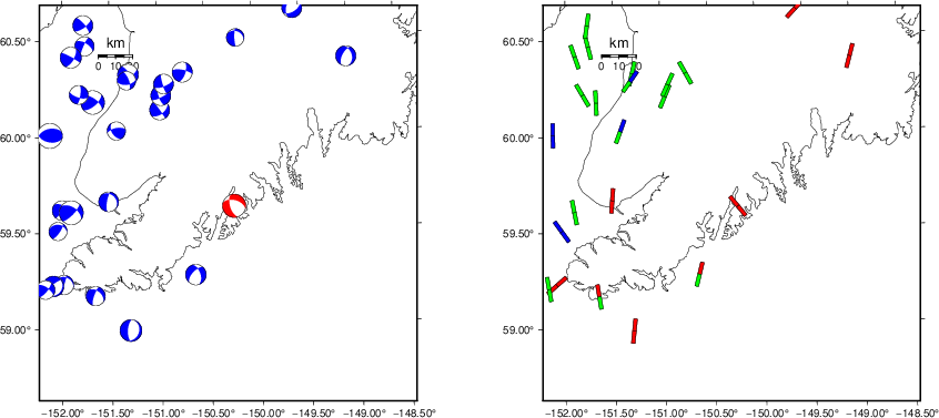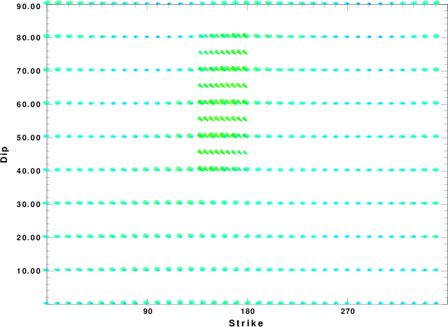 | Focal mechanism sensitivity at the preferred depth. The red color indicates a very good fit to the waveforms. Each solution is plotted as a vector at a given value of strike and dip with the angle of the vector representing the rake angle, measured, with respect to the upward vertical (N) in the figure. |