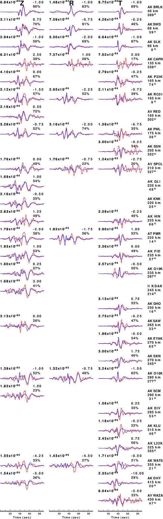 The comparison of the observed and predicted waveforms is given in the next figure. The red traces are the observed and the blue are the predicted. Each observed-predicted component is plotted to the same scale and peak amplitudes are indicated by the numbers to the left of each trace. A pair of numbers is given in black at the right of each predicted traces. The upper number it the time shift required for maximum correlation between the observed and predicted traces. This time shift is required because the synthetics are not computed at exactly the same distance as the observed, the velocity model used in the predictions may not be perfect and the epicentral parameters may be be off. A positive time shift indicates that the prediction is too fast and should be delayed to match the observed trace (shift to the right in this figure). A negative value indicates that the prediction is too slow. The lower number gives the percentage of variance reduction to characterize the individual goodness of fit (100% indicates a perfect fit).