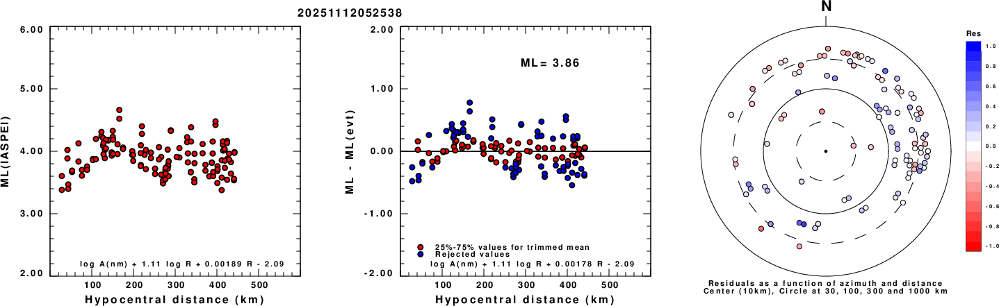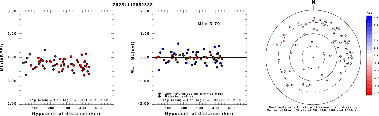 Left: ML computed using the IASPEI formula for Vertical components (research). Center: ML residuals computed using a modified IASPEI formula that accounts for path specific attenuation; the values used for the trimmed mean are indicated. The ML relation used for each figure is given at the bottom of each plot.