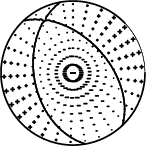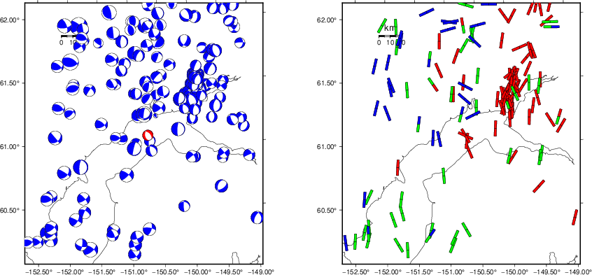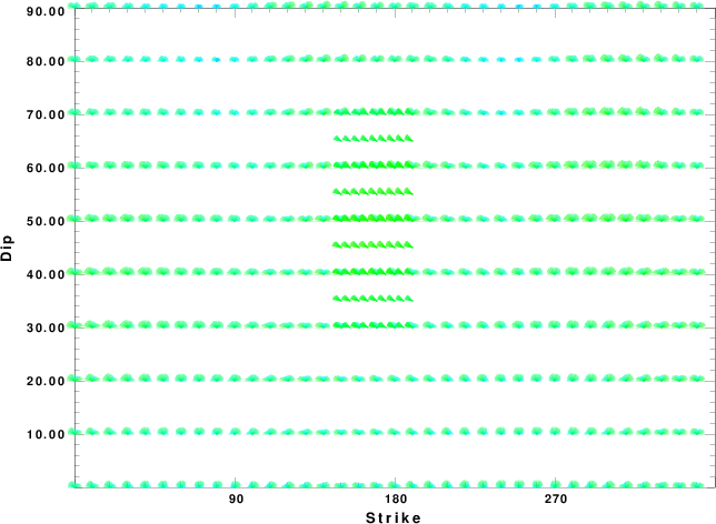 | Focal mechanism sensitivity at the preferred depth. The red color indicates a very good fit to the waveforms. Each solution is plotted as a vector at a given value of strike and dip with the angle of the vector representing the rake angle, measured, with respect to the upward vertical (N) in the figure. |