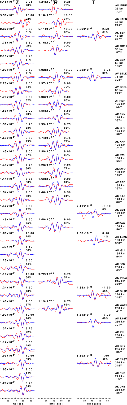 The comparison of the observed and predicted waveforms is given in the next figure. The red traces are the observed and the blue are the predicted. Each observed-predicted component is plotted to the same scale and peak amplitudes are indicated by the numbers to the left of each trace. A pair of numbers is given in black at the right of each predicted traces. The upper number it the time shift required for maximum correlation between the observed and predicted traces. This time shift is required because the synthetics are not computed at exactly the same distance as the observed, the velocity model used in the predictions may not be perfect and the epicentral parameters may be be off. A positive time shift indicates that the prediction is too fast and should be delayed to match the observed trace (shift to the right in this figure). A negative value indicates that the prediction is too slow. The lower number gives the percentage of variance reduction to characterize the individual goodness of fit (100% indicates a perfect fit).