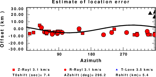 The derived shift in origin time and epicentral coordinates are given at the bottom of the figure.