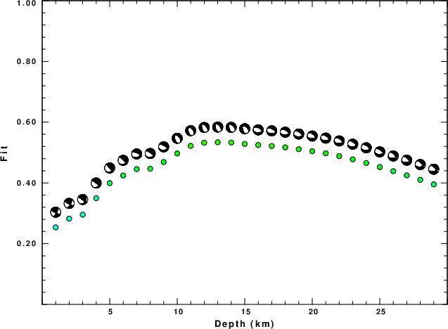 The program wvfgrd96 was used with good traces observed at short distance to determine the focal mechanism, depth and seismic moment. This technique requires a high quality signal and well determined velocity model for the Green's functions. To the extent that these are the quality data, this type of mechanism should be preferred over the radiation pattern technique which requires the separate step of defining the pressure and tension quadrants and the correct strike.