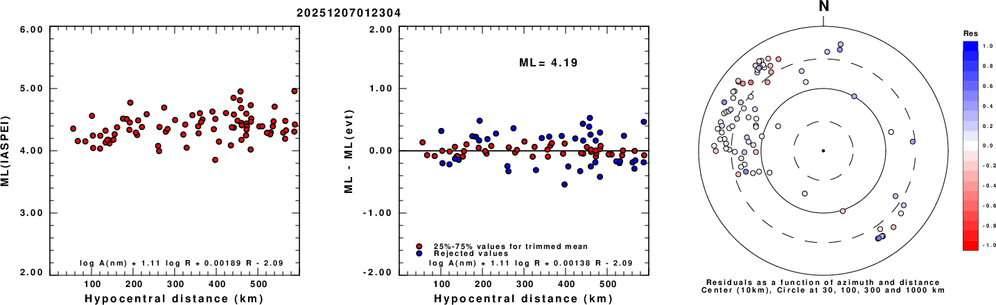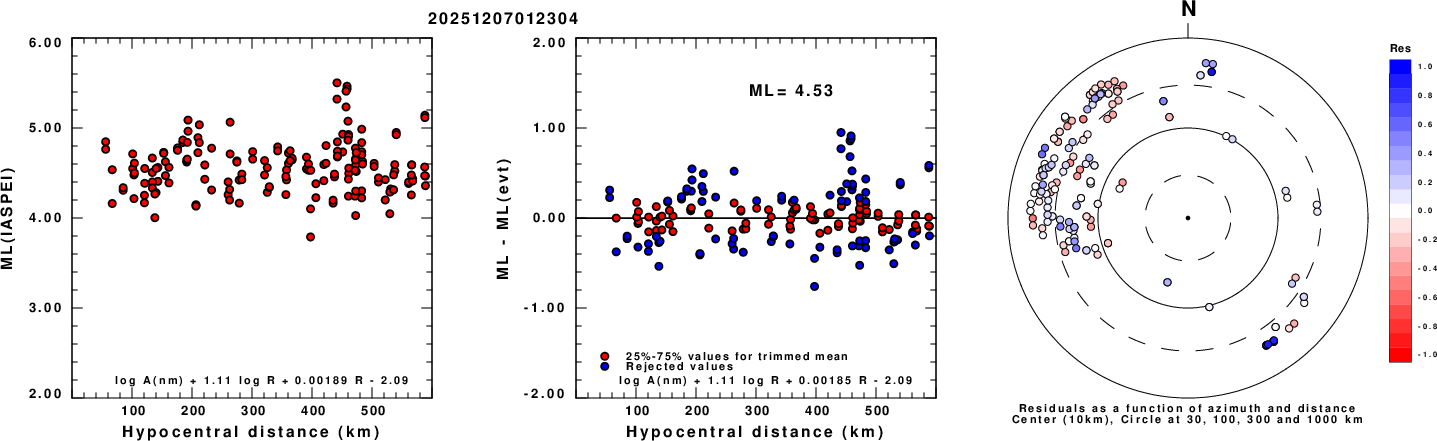 Left: ML computed using the IASPEI formula for Vertical components (research). Center: ML residuals computed using a modified IASPEI formula that accounts for path specific attenuation; the values used for the trimmed mean are indicated. The ML relation used for each figure is given at the bottom of each plot.