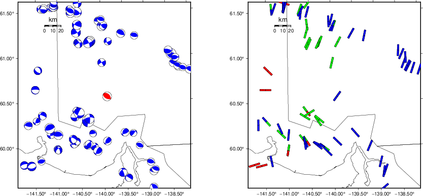 | Focal mechanism sensitivity at the preferred depth. The red color indicates a very good fit to the waveforms. Each solution is plotted as a vector at a given value of strike and dip with the angle of the vector representing the rake angle, measured, with respect to the upward vertical (N) in the figure. |