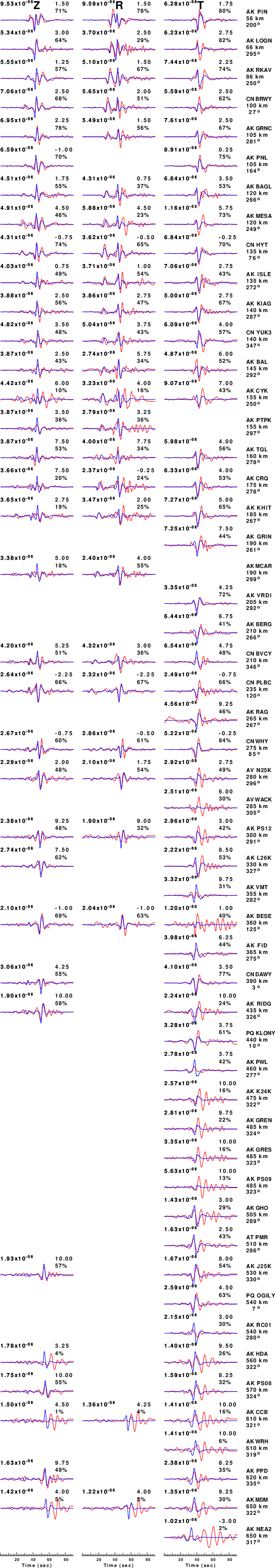 The comparison of the observed and predicted waveforms is given in the next figure. The red traces are the observed and the blue are the predicted. Each observed-predicted component is plotted to the same scale and peak amplitudes are indicated by the numbers to the left of each trace. A pair of numbers is given in black at the right of each predicted traces. The upper number it the time shift required for maximum correlation between the observed and predicted traces. This time shift is required because the synthetics are not computed at exactly the same distance as the observed, the velocity model used in the predictions may not be perfect and the epicentral parameters may be be off. A positive time shift indicates that the prediction is too fast and should be delayed to match the observed trace (shift to the right in this figure). A negative value indicates that the prediction is too slow. The lower number gives the percentage of variance reduction to characterize the individual goodness of fit (100% indicates a perfect fit).