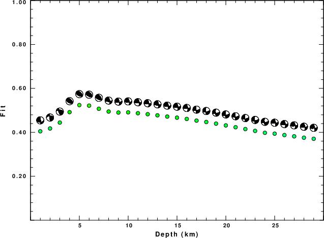 The program wvfgrd96 was used with good traces observed at short distance to determine the focal mechanism, depth and seismic moment. This technique requires a high quality signal and well determined velocity model for the Green's functions. To the extent that these are the quality data, this type of mechanism should be preferred over the radiation pattern technique which requires the separate step of defining the pressure and tension quadrants and the correct strike.