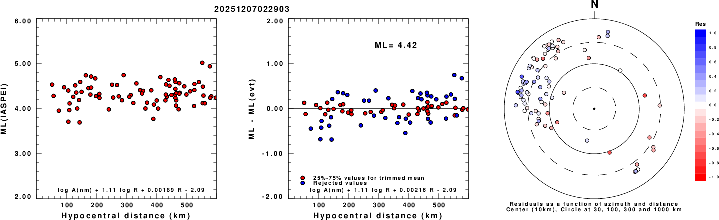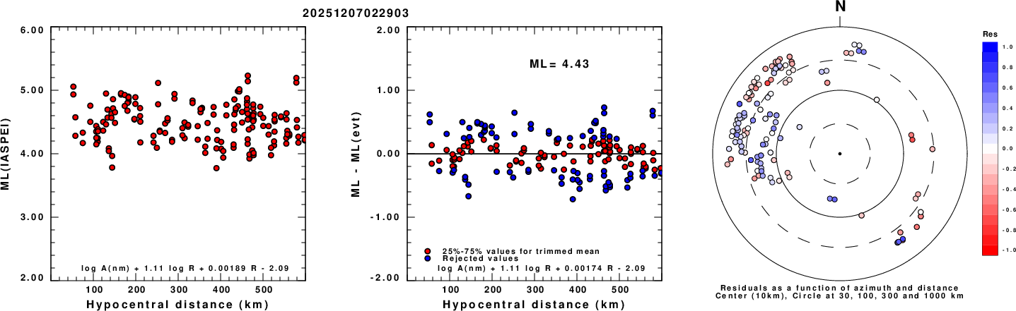 Left: ML computed using the IASPEI formula for Vertical components (research). Center: ML residuals computed using a modified IASPEI formula that accounts for path specific attenuation; the values used for the trimmed mean are indicated. The ML relation used for each figure is given at the bottom of each plot.