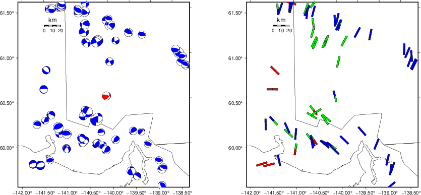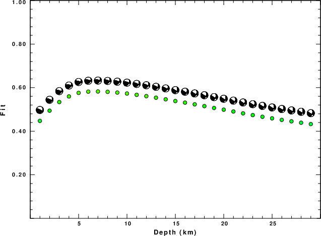 The program wvfgrd96 was used with good traces observed at short distance to determine the focal mechanism, depth and seismic moment. This technique requires a high quality signal and well determined velocity model for the Green's functions. To the extent that these are the quality data, this type of mechanism should be preferred over the radiation pattern technique which requires the separate step of defining the pressure and tension quadrants and the correct strike.