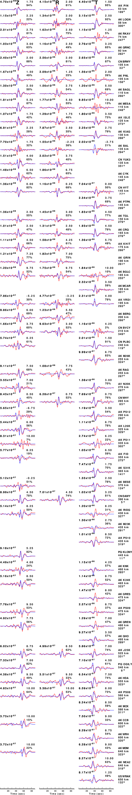 The comparison of the observed and predicted waveforms is given in the next figure. The red traces are the observed and the blue are the predicted. Each observed-predicted component is plotted to the same scale and peak amplitudes are indicated by the numbers to the left of each trace. A pair of numbers is given in black at the right of each predicted traces. The upper number it the time shift required for maximum correlation between the observed and predicted traces. This time shift is required because the synthetics are not computed at exactly the same distance as the observed, the velocity model used in the predictions may not be perfect and the epicentral parameters may be be off. A positive time shift indicates that the prediction is too fast and should be delayed to match the observed trace (shift to the right in this figure). A negative value indicates that the prediction is too slow. The lower number gives the percentage of variance reduction to characterize the individual goodness of fit (100% indicates a perfect fit).
