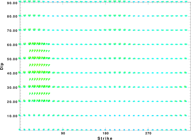 | Focal mechanism sensitivity at the preferred depth. The red color indicates a very good fit to the waveforms. Each solution is plotted as a vector at a given value of strike and dip with the angle of the vector representing the rake angle, measured, with respect to the upward vertical (N) in the figure. |