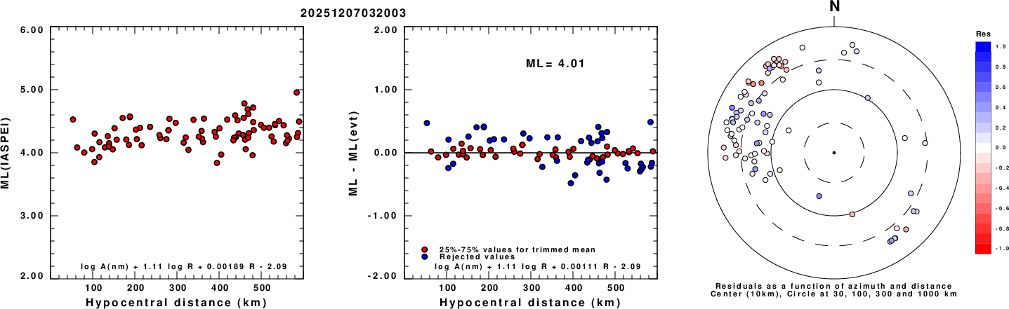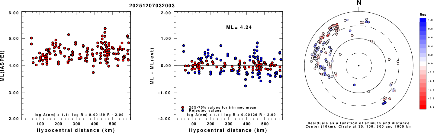 Left: ML computed using the IASPEI formula for Vertical components (research). Center: ML residuals computed using a modified IASPEI formula that accounts for path specific attenuation; the values used for the trimmed mean are indicated. The ML relation used for each figure is given at the bottom of each plot.