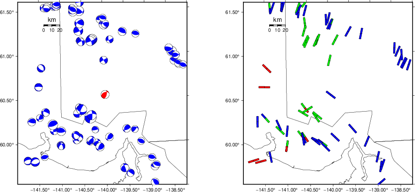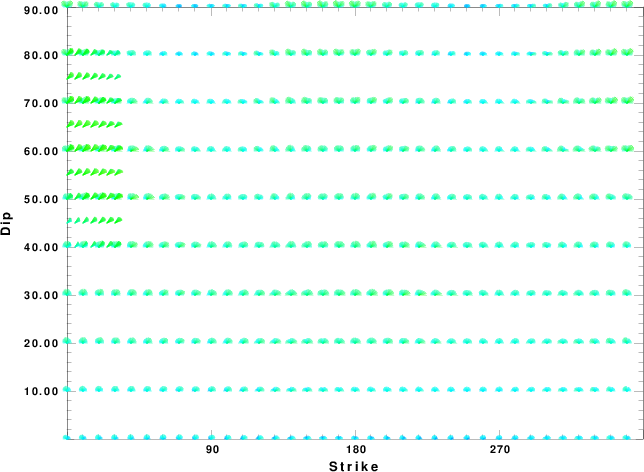 | Focal mechanism sensitivity at the preferred depth. The red color indicates a very good fit to the waveforms. Each solution is plotted as a vector at a given value of strike and dip with the angle of the vector representing the rake angle, measured, with respect to the upward vertical (N) in the figure. |