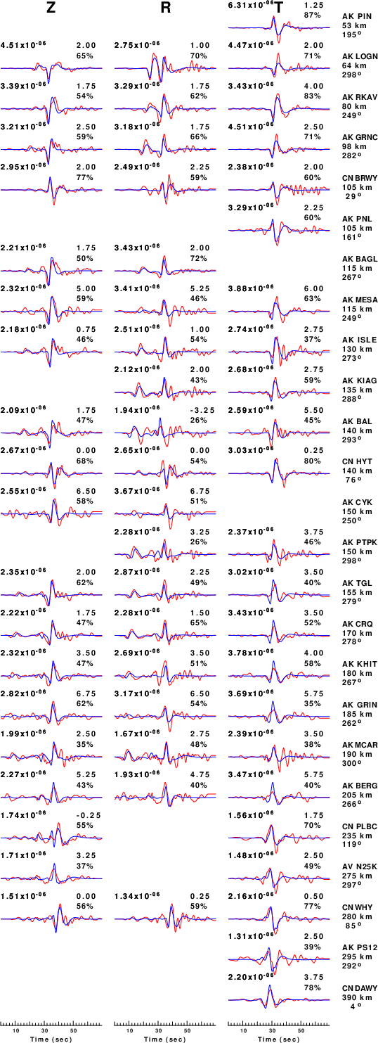 The comparison of the observed and predicted waveforms is given in the next figure. The red traces are the observed and the blue are the predicted. Each observed-predicted component is plotted to the same scale and peak amplitudes are indicated by the numbers to the left of each trace. A pair of numbers is given in black at the right of each predicted traces. The upper number it the time shift required for maximum correlation between the observed and predicted traces. This time shift is required because the synthetics are not computed at exactly the same distance as the observed, the velocity model used in the predictions may not be perfect and the epicentral parameters may be be off. A positive time shift indicates that the prediction is too fast and should be delayed to match the observed trace (shift to the right in this figure). A negative value indicates that the prediction is too slow. The lower number gives the percentage of variance reduction to characterize the individual goodness of fit (100% indicates a perfect fit).