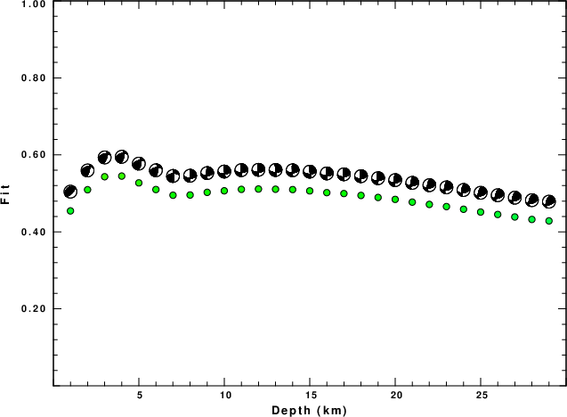 The program wvfgrd96 was used with good traces observed at short distance to determine the focal mechanism, depth and seismic moment. This technique requires a high quality signal and well determined velocity model for the Green's functions. To the extent that these are the quality data, this type of mechanism should be preferred over the radiation pattern technique which requires the separate step of defining the pressure and tension quadrants and the correct strike.