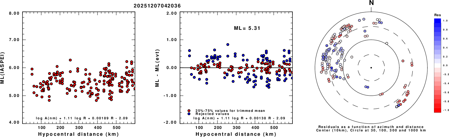 Left: ML computed using the IASPEI formula for Vertical components (research). Center: ML residuals computed using a modified IASPEI formula that accounts for path specific attenuation; the values used for the trimmed mean are indicated. The ML relation used for each figure is given at the bottom of each plot.